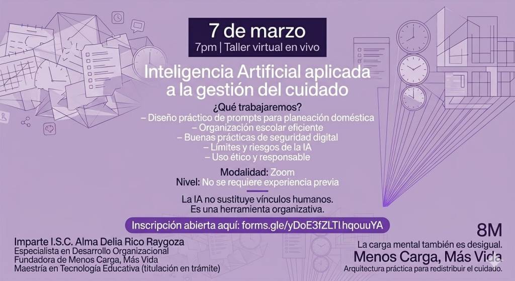 Este taller nació de una pregunta sencilla: ¿qué pasaría si las personas que sostienen la vida cotidiana de sus familias tuvieran una herramienta para liberar parte de esa carga? No para que la carga desaparezca, eso requiere mucho más que tecnología, sino para que haya un poco más de espacio para respirar, descansar y decidir.